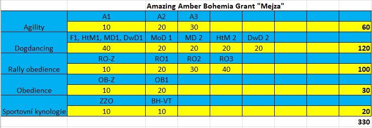 Amazing Amber Bohemia Grant "Mejzinka" majitel: Markéta Korintová Mejzinka je naprosto univerzální sportovec, cokoli jí ukážete, bude dělat. Primárně se věnuje rally obedience a obedience. Ale občas si odskočí složit nějakou tu dogdancingovou zkoušku.